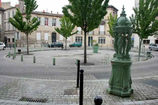 Similarly, this next fountain is the focal point of another former blog subject: Place Georges-de-Porto-Riche, in the side-streets between Rue Sainte-Catherine and Place de la Bourse.