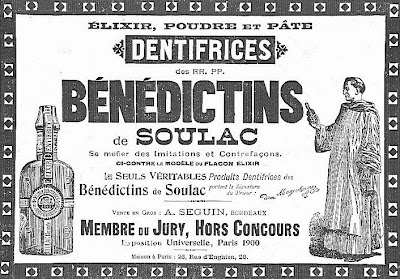 It was Adam over at Invisible Paris who first spotted this 1895 advertisement for a unique range of dental hygiene products: “Dentifrices des RR. PP. Bénédictins de l’Abbaye de Soulac (Gironde)”. As the distributors, Seguin, were based in Bordeaux, it seemed like a potential subject for this website, but piecing the full story together proved to be a difficult case of working out where the facts end and the work of 19th-century marketing types begins!